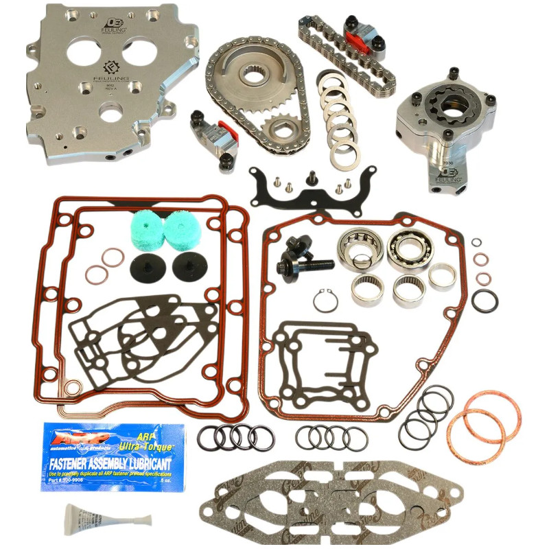 Kits de la marque FEULING avec pompe a huile et conversion de patins a ressort en hydrauliques pour moteurs Twin Cam en 1999-2006 Touring, 1999-2005 Dyna et 2000-2006 Softail . Ce kit est conçu uniquement pour les modèles 99 à 01 avec l'allumage d'origine.