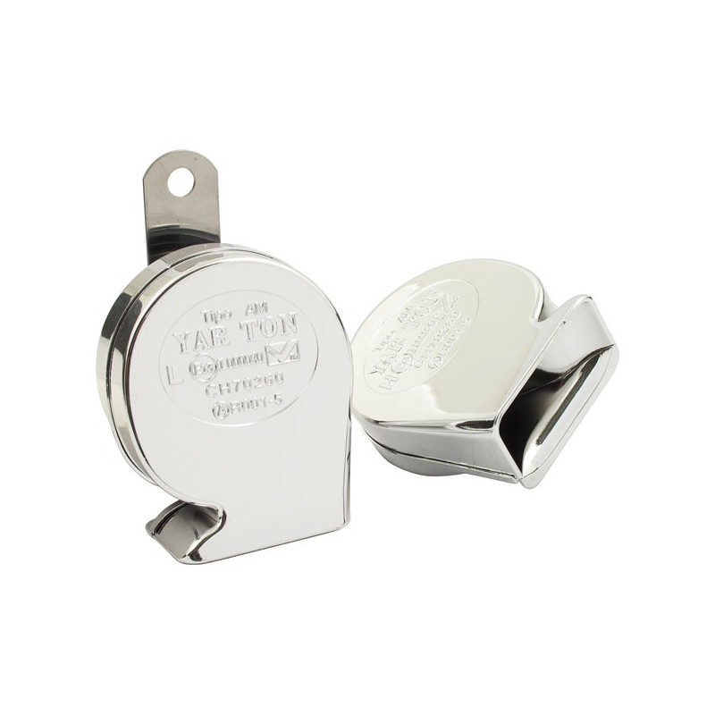 Kit de deux klaxon chromés, 12V, en forme de turbine 89mm. Un avec ton grave de type US et l'autre ton aigue. +- 110db.